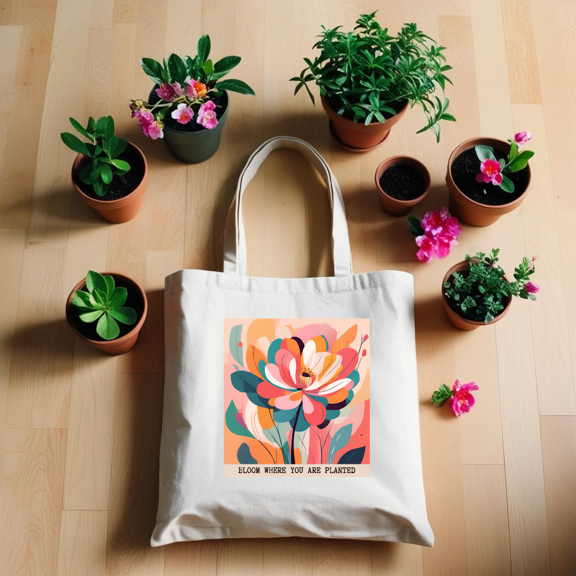 Express your passion for the Bloom Tote Bag! Embrace positivity with the "Bloom where you are planted" design and vibrant colors. Perfect for carrying your essentials and spreading inspiration wherever you go. Elevate your style and attitude with this must-have tote bag.