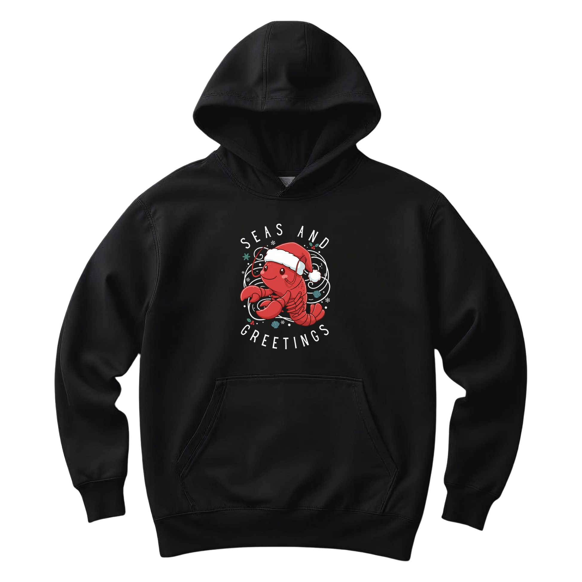 Spread Seas and Greetings with our delightfully cheerful black hoodie featuring an adorable lobster in a Santa hat! This playful design showcases a bright colored lobster surrounded by festive waves and snowflakes, bringing coastal charm and holiday joy together.